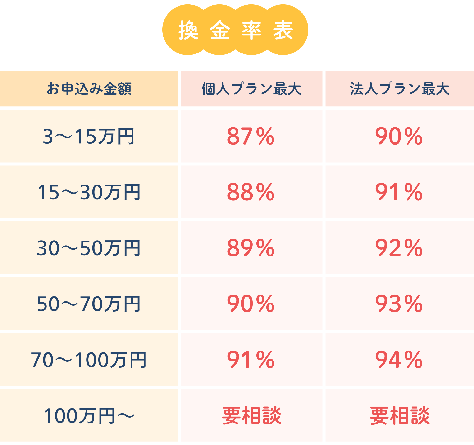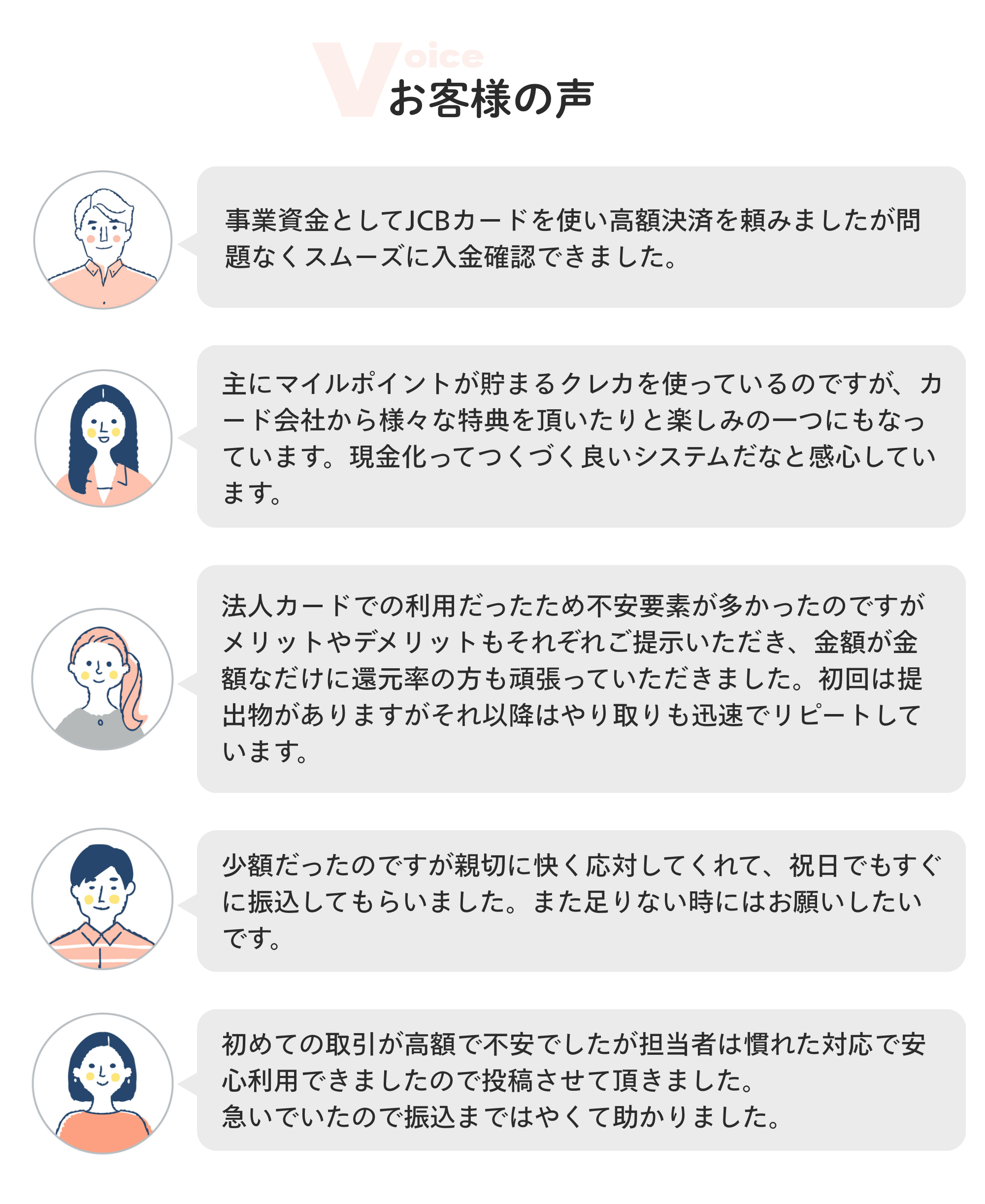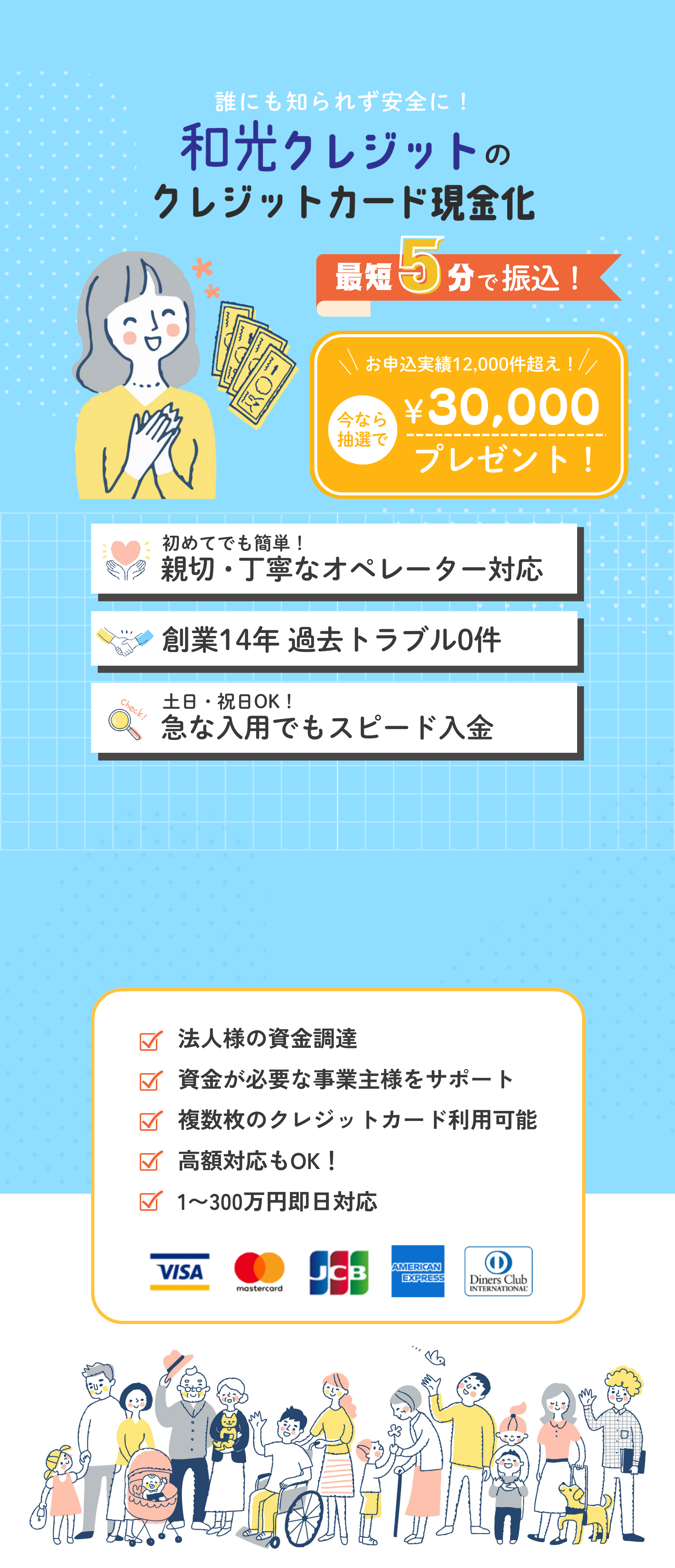 一度に複数枚のクレジットカードを使いましてご利用は出来ます。当店では法人カードに多い『アメックス/JCB/ダイナース』での多くの実績があり、高額の現金化も安全にご利用いただけます。
